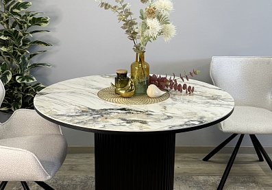 Гостиная с матовыми фасадами, выполненная в актуальном бежевом оттенке с элементами черного цвета может сочетаться с чем угодно. На мутборде мебель дополнена текстурной отделкой стен, ковром с минималистичным узором в приглушенных тонах,  пуфом глубокого коричнево-серого оттенка. Черная люстра с золотыми элементами, декоративные элементы завершат образ стильной гостиной.