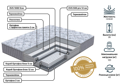 Высокий односторонний матрас премиум класса с низкой жесткостью, обеспечивает неповторимый уровень комфорта. Благодаря современным материалам с функцией памяти, матрас способен подстраиваться под индивидуальные особенности вашего тела. В основе матраса уникальная система из двух блоков независимых пружин с повышенным ортопедическим эффектом. Нижний пружинный блок состоит из 512 независимых пружин, он обладает ортопедическими свойствами и берет на себя большую часть нагрузки. Верхний блок состоит из 1000 пружин на спальное место, которые равномерно распределяют нагрузку и обеспечивают точечную поддержку тела.