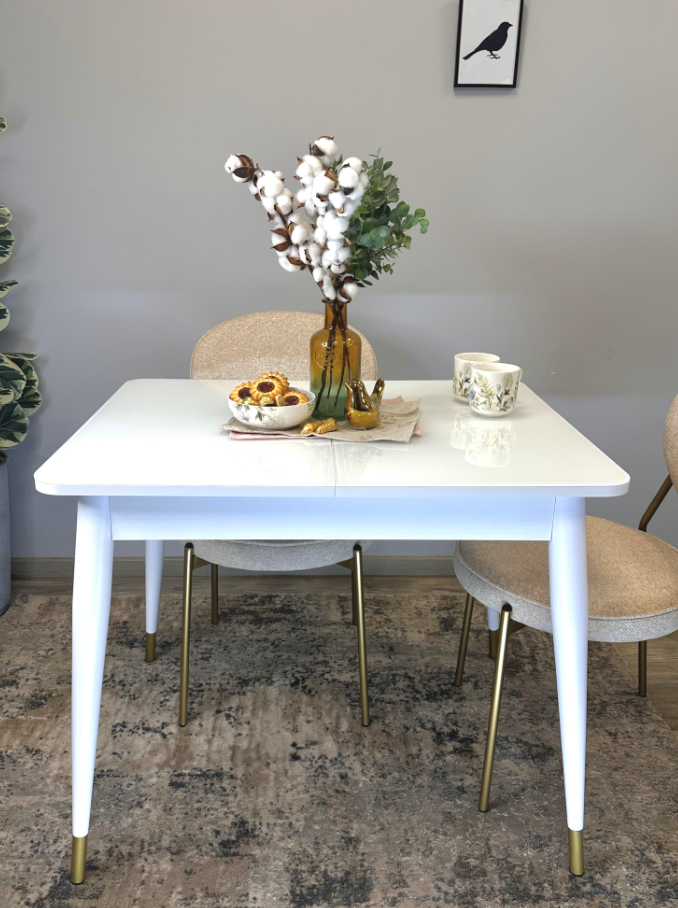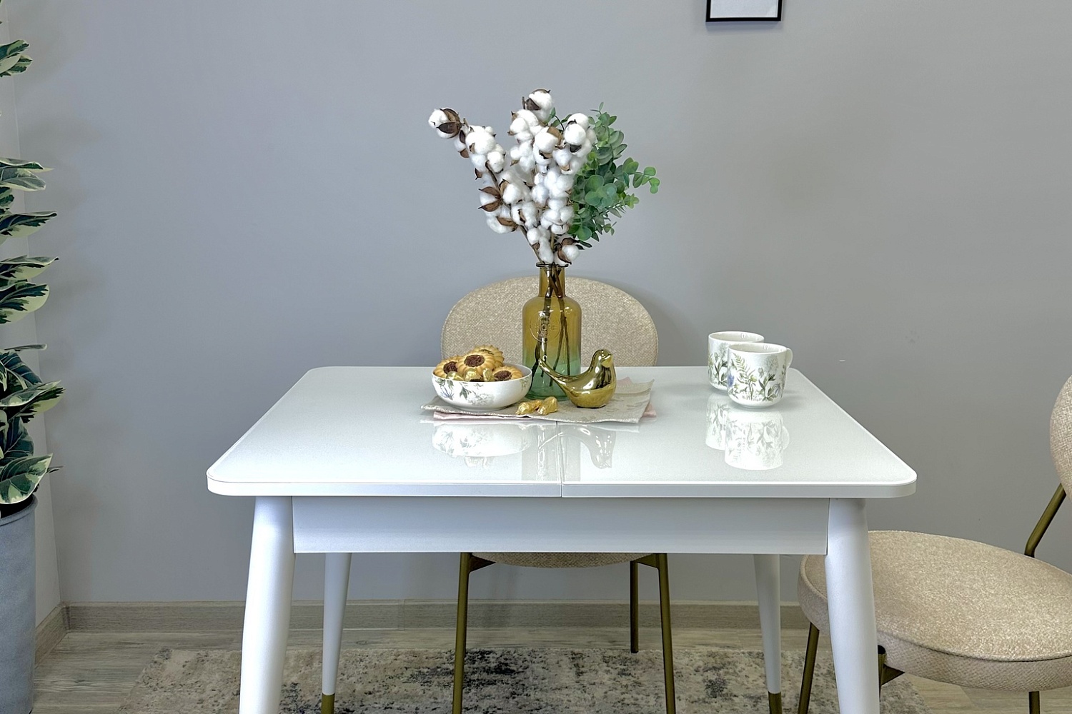 Стол обеденный Мане прямоугольный раздвижной К1100 опоры белого цвета с металлическими наконечниками, столешница - стекло белый глянец.