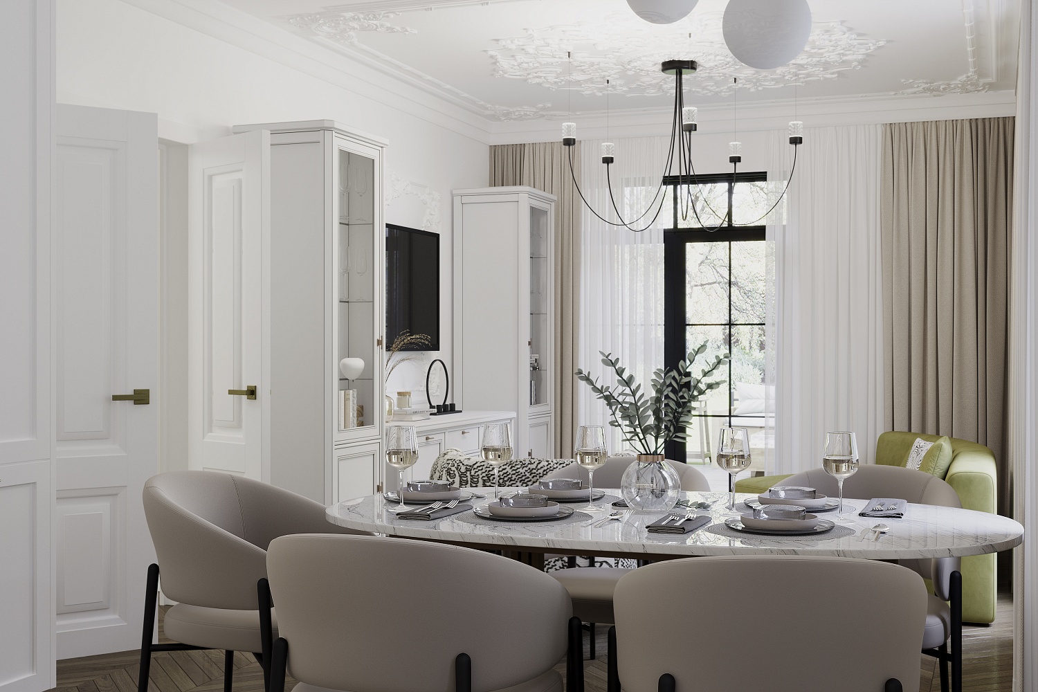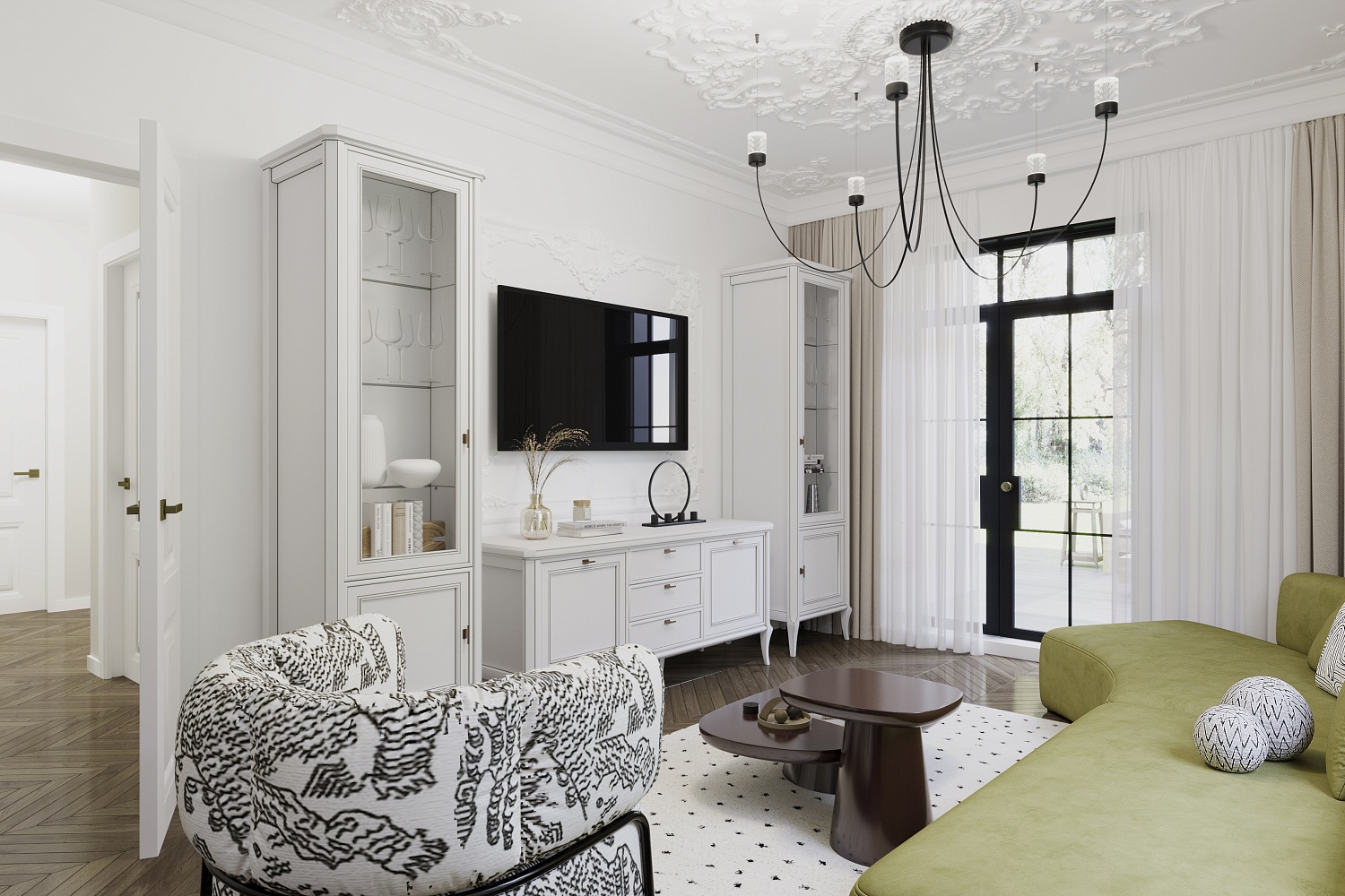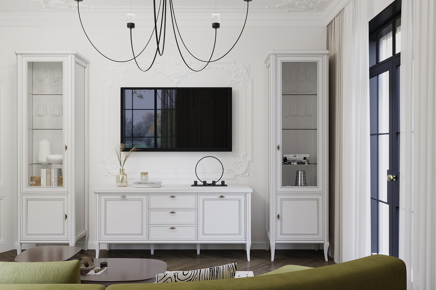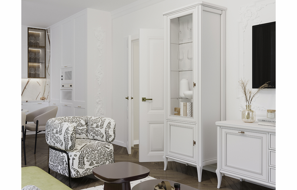 – описание: назначение для гостиной, размер 214.8x287x50.5 см, стиль неоклассика, цвет бело-серый.