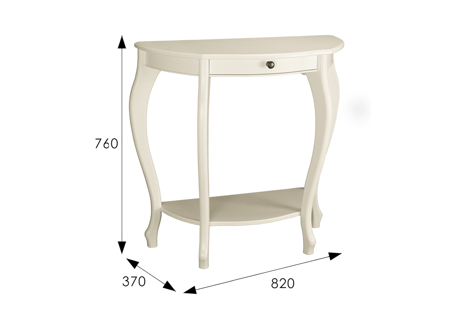 Столешница полукруглой формы выполнена из прочного, износостойкого МДФ, основание — из натуральной древесины. Лакированное глянцевое покрытие смотрится изысканно и благородно, фигурные ножки подчеркивают элегантность изделия. Широкий выдвижной ящик снабжен точечной круглой ручкой, декорированной «под золото».